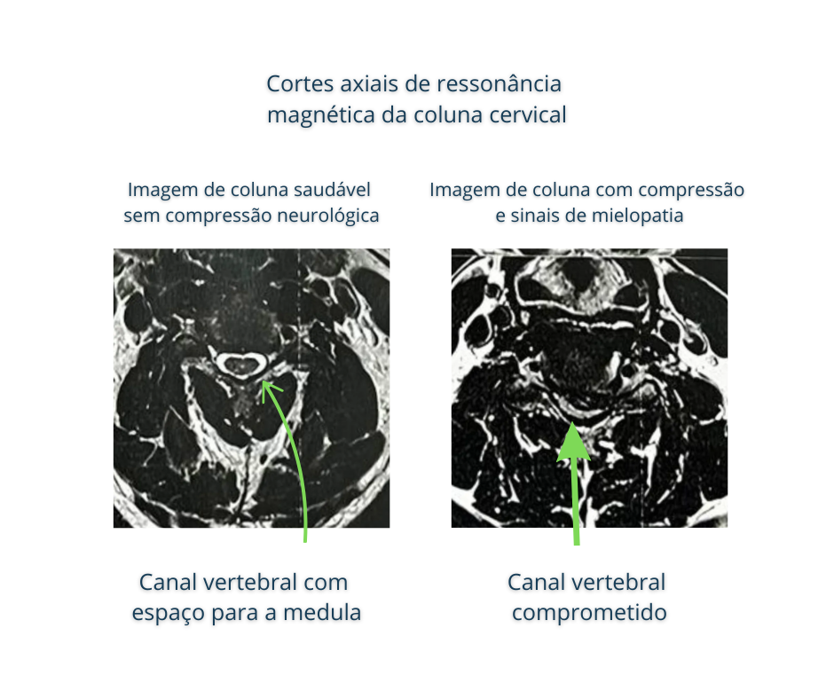 Essas alterações reduzem o espaço disponível para a medula, dificultando a passagem dos impulsos nervosos e causando prejuízos na condução dos impulsos nervosos. Em alguns casos, a compressão é tão intensa que causa “sofrimento” da medula, o que recebe o nome de mielopatia.