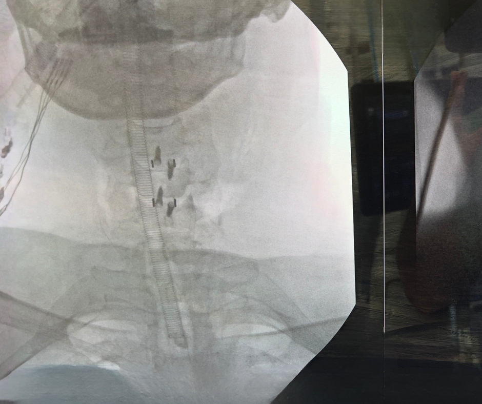 Imagem de pós-operatório de artrodese para descompressão medular em paciente com mielopatia cervical