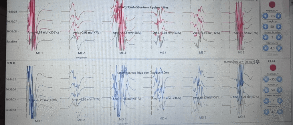 Exemplo real de neuromonitorização realizada durante a cirurgia de coluna.